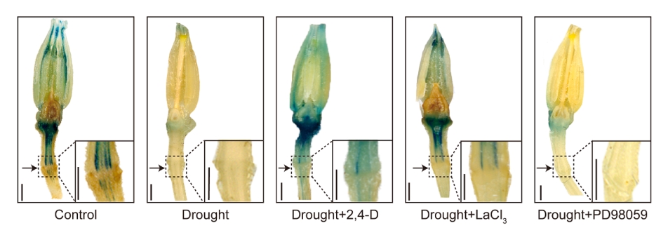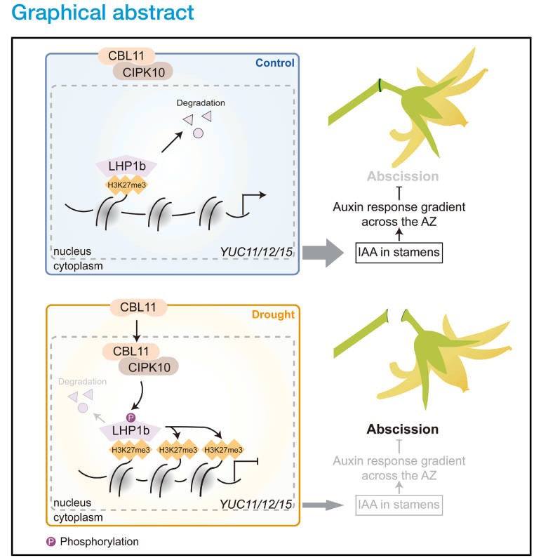 該研究發(fā)現(xiàn),干旱脅迫下SlCBL11/SlCIPK10-SlLHP1b信號(hào)模塊誘導(dǎo)番茄落花的作用機(jī)制。干旱脅迫激活SlCBL11-SlCIPK10鈣離子感受器模塊,磷酸化修飾SlLHP1b。磷酸化的SlLHP1b通過(guò)H3K27me3依賴(lài)的方式結(jié)合下游生長(zhǎng)素合成基因SlYUCs的啟動(dòng)子區(qū)域抑制其表達(dá),導(dǎo)致雄蕊中生長(zhǎng)素合成減少,破壞離區(qū)生長(zhǎng)素梯度,誘發(fā)番茄落花。該研究揭示了干旱下鈣信號(hào)通過(guò)表觀遺傳調(diào)控生長(zhǎng)素合成參與番茄落花的分子機(jī)制,進(jìn)一步完善了植物逆境響應(yīng)中鈣信號(hào)與表觀遺傳調(diào)控的分子網(wǎng)絡(luò),還為培育耐旱、高產(chǎn)的品種提供了潛在的基因靶點(diǎn)。研究成果對(duì)提高逆境下的番茄產(chǎn)量,提高經(jīng)濟(jì)效益具有重要的指導(dǎo)意義。該研究獲國(guó)家重點(diǎn)研發(fā)計(jì)劃項(xiàng)目、國(guó)家自然科學(xué)基金面上項(xiàng)目和青年科學(xué)基金等項(xiàng)目支持。