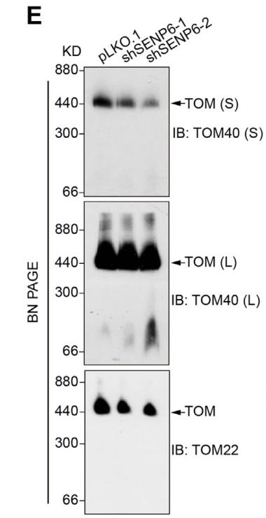 SUMO 化通過共價 SUMO 結(jié)合賴氨酸殘基來動態(tài)修飾蛋白質(zhì),由 E1 激活酶、E2 結(jié)合酶和 E3 連接酶介導,而去 SUMO 化則由 SENPs 調(diào)控。與泛素化介導的降解不同,SUMO化會調(diào)節(jié)蛋白質(zhì)的活性、定位和穩(wěn)定性,從而影響基因表達、基因組完整性、細胞周期、細胞凋亡和免疫功能。最近的研究表明,SUMO化/去SUMO化參與調(diào)控線粒體的生物合成、動力學、線粒體自噬和線粒體未折疊蛋白反應(UPRmt)。此外,線粒體蛋白質(zhì)輸入障礙和蛋白質(zhì)穩(wěn)態(tài)受損會引發(fā)酵母中線粒體蛋白質(zhì)的SUMO化,這表明SUMO化可能也在線粒體蛋白質(zhì)輸入系統(tǒng)中發(fā)揮作用。SENP6特異性地裂解polySUMO2/3鏈,從而調(diào)控DNA修復、細胞凋亡、衰老、著絲粒組裝、炎癥、小膠質(zhì)細胞極化、血管生成和核結(jié)構(gòu)。其功能障礙與淋巴瘤、核纖層蛋白病和骨骼衰老有關(guān)。然而,SENP6 在線粒體穩(wěn)態(tài)中的作用仍未得到深入研究。
