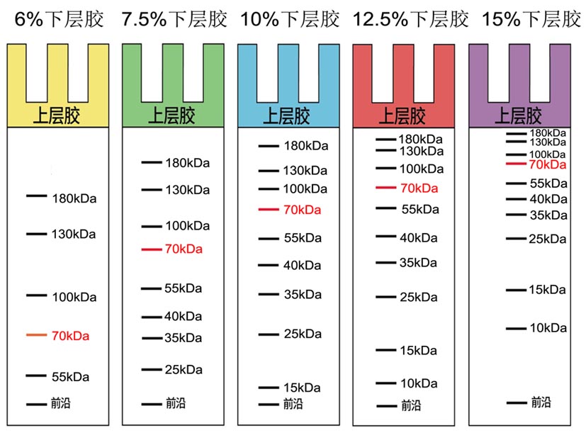 kDa,含有 10 條蛋白條帶 ) 在不同濃度的 SDS-PAGE凝膠中的分離示意圖。因溫度、pH 值等因素不同,實(shí)際分離情況會(huì)略有出入,本圖僅供參考。