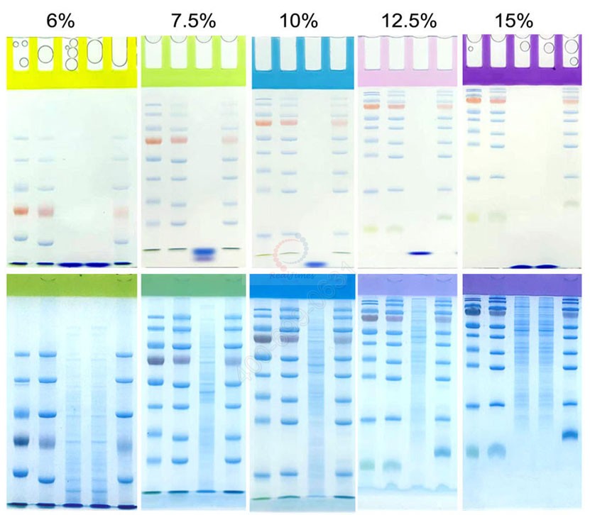 該產(chǎn)品利用聚丙烯酰胺凝膠電泳原理,采用上層膠和下層膠的預(yù)混配方,只需加入改良型促凝劑即可凝膠,灌入下層膠后,無需等待凝膠,直接灌入上層膠即可,簡便快捷可在15分鐘內(nèi)配制得到高質(zhì)量的聚丙烯酰胺凝膠,可用于變性和非變性蛋白凝膠電泳,適用于Tris-甘氨酸電泳體系(Laemmli體系)。五種上層膠顏色設(shè)計,點樣孔清晰易辨,方便點樣,可以配制6%(黃色上層膠)、7.5%(綠色上層膠)、10%(藍色上層膠)、12.5%(紅色上層膠)和15%(紫色上層膠)的分離膠濃度,可以滿足絕大多數(shù)蛋白電泳需求。