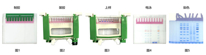 圖1和圖2為使用PAGE上層膠紅色染料配制的上層膠被染成紅色,上樣孔一目了然,易于判斷上樣孔是否歪曲或破損;圖3是上樣后的效果圖,上層膠和樣品非常清晰;圖4為預(yù)染蛋白分子量Marker電泳后的效果,染料保留在上層膠中,不會(huì)隨著電泳而遷移;圖5為凝膠染色后的效果,樣品分離清晰,泳道無豎條拖尾,染料不影響電泳結(jié)果。