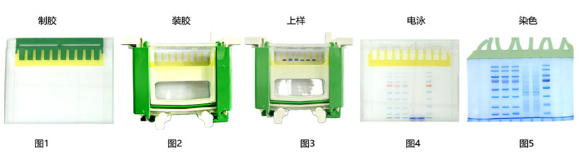 圖1和圖2為使用PAGE上層膠黃色染料配制的上層膠被染成黃色,上樣孔一目了然,易于判斷上樣孔是否歪曲或破損;圖3是上樣后的效果圖,上層膠和樣品非常清晰;圖4為預(yù)染蛋白分子量Marker電泳后的效果,染料保留在上層膠中,不會隨著電泳而遷移;圖5為凝膠染色后的效果,樣品分離清晰,泳道無豎條拖尾,染料不影響電泳結(jié)果。