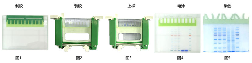 圖1和圖2為使用PAGE上層膠綠色染料配制的上層膠被染成綠色,上樣孔一目了然,易于判斷上樣孔是否歪曲或破損;圖3是上樣后的效果圖,上層膠和樣品非常清晰;圖4為預(yù)染蛋白分子量Marker電泳后的效果,染料保留在上層膠中,不會隨著電泳而遷移;圖5為凝膠染色后的效果,樣品分離清晰,泳道無豎條拖尾,染料不影響電泳結(jié)果。
