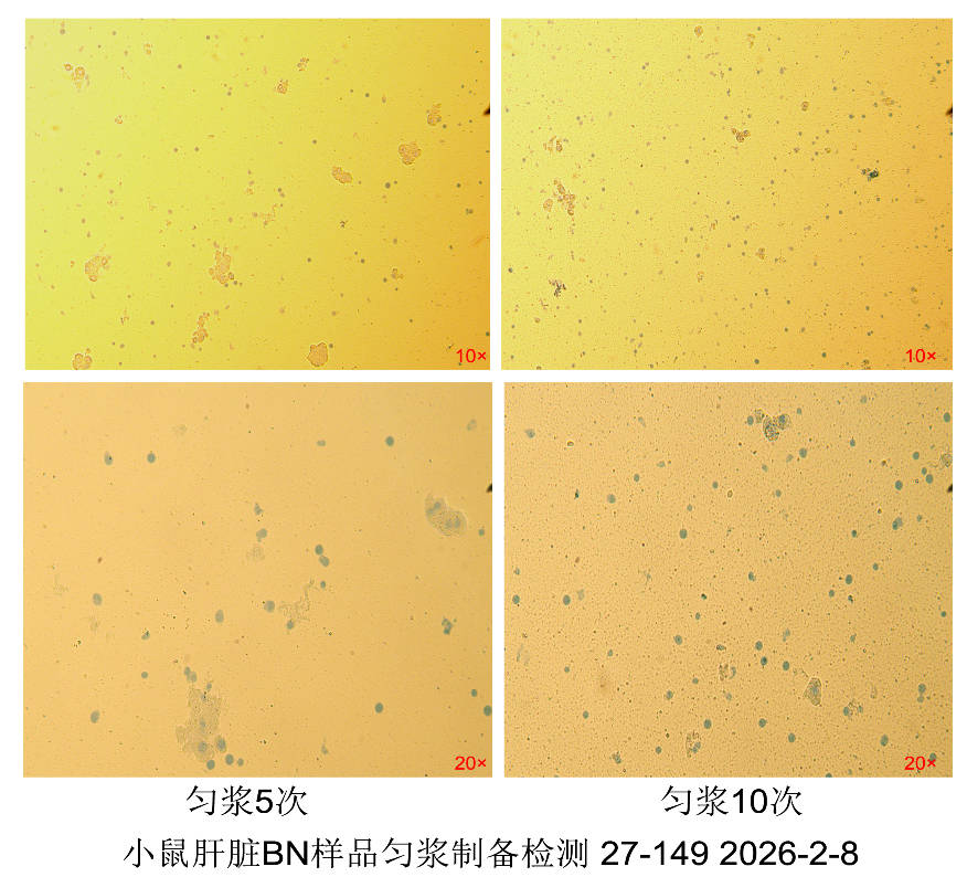 注:此勻漿步驟為關(guān)鍵環(huán)節(jié)。玻璃勻漿器(緊致型)上下推拉一次為一次完整勻漿,勻漿本著寧少勿多,不夠再補(bǔ)的原則,不要過度勻漿。勻漿破碎效果與組織類型有關(guān),不同的樣品所需勻漿次數(shù)不同,軟組織如肺,脾臟,腎臟,腦等需要10次左右,硬組織如心臟,骨骼肌等需要15次左右。鑒定方法:取10 μl勻漿后的樣品,加入等體積的臺(tái)盼藍(lán)溶液,混勻,在顯微鏡下觀察臺(tái)盼藍(lán)溶液染色陽性(藍(lán)色)細(xì)胞數(shù)目的比例,當(dāng)陽性(藍(lán)色)細(xì)胞破碎達(dá)到80%即可停止勻漿,請(qǐng)勿過度勻漿。若陽性(藍(lán)色)細(xì)胞比例未達(dá)到80%,適當(dāng)增加1-2次勻漿,隨后按照同樣的方法使用臺(tái)盼藍(lán)溶液進(jìn)行鑒定。
