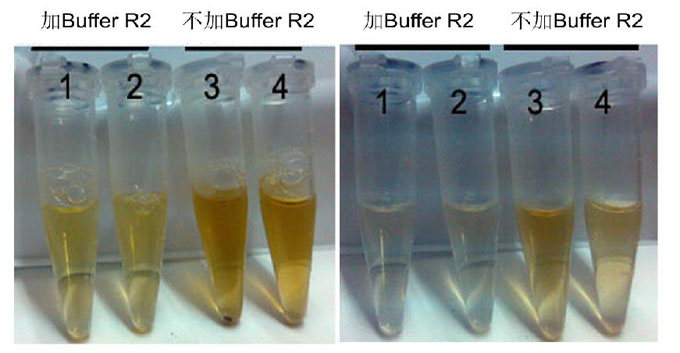 裂解時(shí)加有Buffer R2的,再經(jīng)Buffer R4處理幾乎不再有顏色(右1,右2),