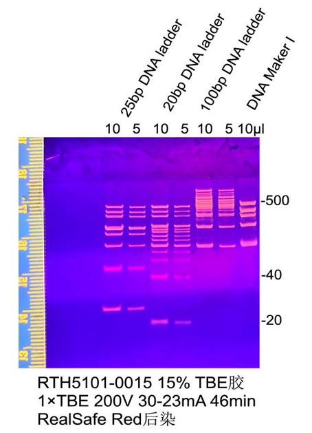 1.2 TBE- PAGE非變性電泳雙鏈DNA Marker可以選擇10 bp DNA ladder(10-100 bp)(貨號:RTM443)或20 bp DNA ladder(20-500 bp)(貨號:RTM441)或25 bp DNA ladder(25-500bp)(貨號:RTM444)作為分子量標(biāo)準(zhǔn);單鏈DNA Marker可以選擇單鏈DNA Marker(20-75 nt)非預(yù)混型(貨號:RTM507)或單鏈DNA Marker(10-75 nt)非預(yù)混型(貨號:RTM509)。