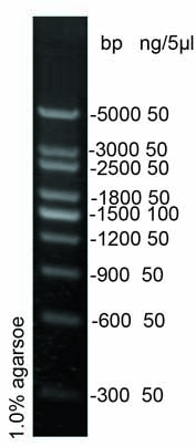 本產(chǎn)品是由9條帶狀雙鏈DNA組成,適用于瓊脂糖凝膠電泳中DNA條帶的分析。本產(chǎn)品為即用型產(chǎn)品,已含有1×loading buffer,可根據(jù)實(shí)驗(yàn)需要,直接取2-5μl電泳,使用方便,電泳圖像清晰。 本產(chǎn)品中9條帶為300,600,9001200,15001800,2500,30005000bp,其中1500bp條帶為100ng/5μl,其余條帶濃度為50ng/5μl。