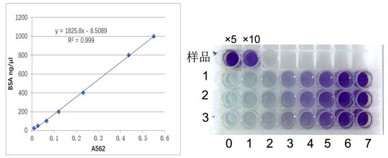 3.6 以BSA含量為縱坐標(biāo),A562為橫坐標(biāo),繪制標(biāo)準(zhǔn)曲線,計(jì)算樣品中的蛋白濃度。如果所得到的蛋白濃度不在標(biāo)準(zhǔn)曲線范圍內(nèi),請稀釋樣品后重新測定。