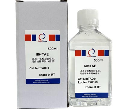 TAE 即 Tris acetate-EDTA buffer ,50×TAE是 50 倍濃縮的 TAE,使用時(shí)需用蒸餾水稀釋 50 倍后再使用,1×TAE工作液中組份濃度:40 mM Tris-acetate,2 mM EDTA,pH8.0。