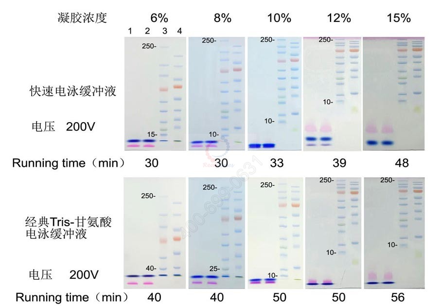 SDS,pH8.3)相比,本快速電泳液可以大幅加快電泳速度,縮短電泳時間。推薦200-250 V恒壓電泳,低于10%膠濃度凝膠通常20-35分鐘就能完成電泳。